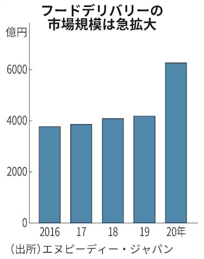 新型コロナウイルス感染症拡大の影響で、デリバリーの市場は急拡大しています。市場は2020年に6264億円と、19年から50%増加しています。