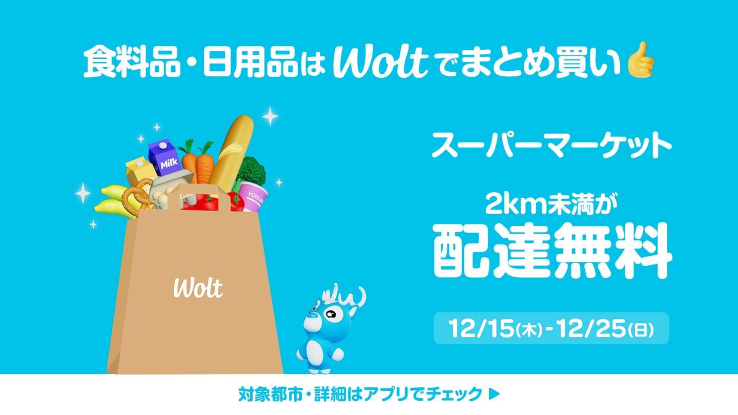 初めてWolt(ウォルト)をご利用いただくお客様の4回の配達注文が合計 4,000割引(¥1,000×4)になります。プロモコードの登録期限は2024年12月31日まで、登録後は30日間ご利用いただけます。※以下のボタンからの注文のみ適用になります!